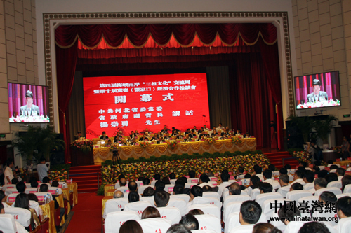 第四屆海峽兩岸“三祖文化”交流周暨第十屆冀臺經(jīng)濟合作洽談會今天下午在張家口開幕。中共中央臺辦、國務(wù)院臺辦主任王毅、海協(xié)會會長陳云林、河北省委副書記付志方以及中國國民黨副主席林豐正、全國臺企聯(lián)會長郭山輝等1200多名海峽兩岸各界人士出席開幕式。(中國臺灣網(wǎng) 王偉 攝)