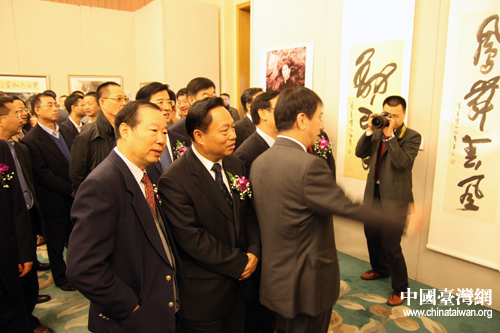 參加開幕式的嘉賓在樓柏安的陪同下參觀畫展中的書畫精品。(中國臺灣網(wǎng) 蕪同 攝)