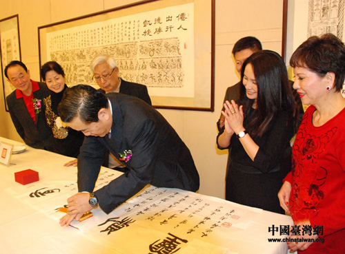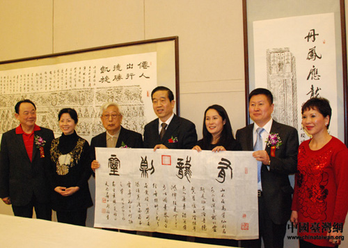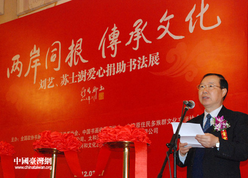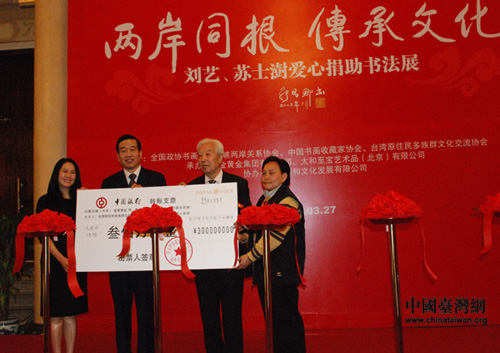 中國(guó)臺(tái)灣網(wǎng)3月28日北京消息 由全國(guó)政協(xié)書(shū)畫(huà)室、中國(guó)書(shū)畫(huà)收藏家協(xié)會(huì)主辦的“兩岸同根,傳承文化——?jiǎng)⑺嚒⑻K士澍愛(ài)心捐助書(shū)法展”昨日上午在全國(guó)政協(xié)禮堂隆重舉行;顒(dòng)共展出劉藝、蘇士澍兩位當(dāng)代著名書(shū)法家作品80余幅。同時(shí),兩位名家還當(dāng)場(chǎng)向臺(tái)灣省花蓮縣秀林鄉(xiāng)捐贈(zèng)人民幣300萬(wàn)元籌建“愛(ài)心圖書(shū)館”。原全國(guó)政協(xié)副主席、政協(xié)書(shū)畫(huà)室主任張思卿,海峽兩岸關(guān)系協(xié)會(huì)副會(huì)長(zhǎng)王在希,臺(tái)灣地區(qū)少數(shù)民族民意代表高金素梅等出席活動(dòng)。