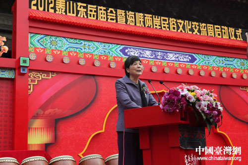 中國臺灣網4月2日泰安消息 4月2日上午9時,由山東省泰安市人民政府主辦,泰山風景名勝區管理委員會、泰安市人民政府臺灣事務辦公室承辦的“2012泰山東岳廟會暨海峽兩岸民俗文化交流周”啟會儀式在山東泰安舉行。中國國民黨中央評議委員會主席團主席葉金鳳出席大會并致辭。