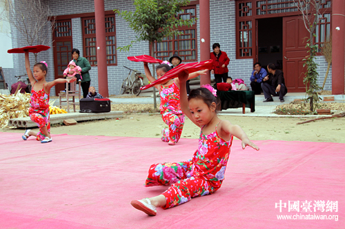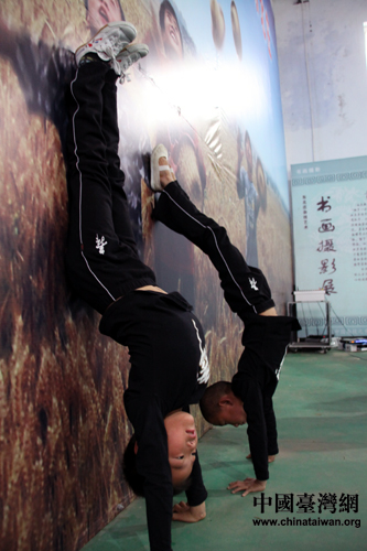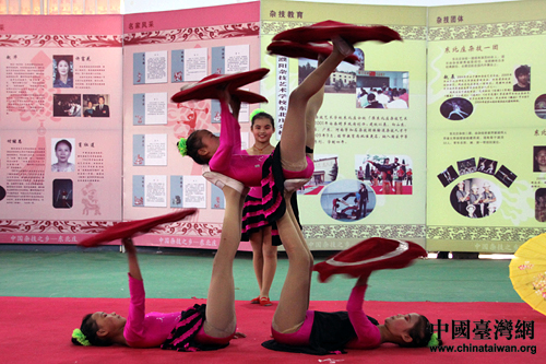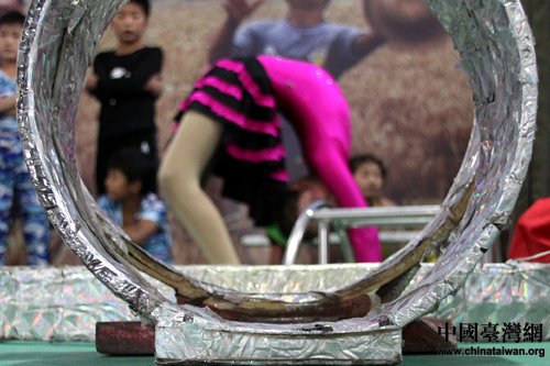 中國臺灣網9月25日河南消息 鉆圈、柔功、硬氣功、魔術……今天,濮陽東北莊雜技藝術團的孩子們為兩岸記者奉上了精彩的演出。