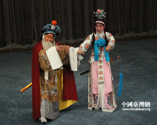 裴艷玲(左)與臺(tái)灣弟子、著名昆曲小生演員楊汗如深情演繹昆曲《浣紗記·寄子》。(中國(guó)臺(tái)灣網(wǎng) 趙靜 攝)