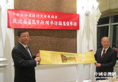 白雪峰與臺灣中華金融業(yè)務研究發(fā)展協(xié)會理事長王榮周互換禮品。(圖片來源:葫蘆島市臺辦)