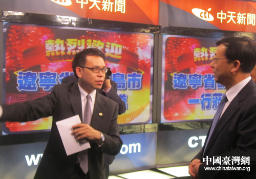 中天電視臺工作人員為白雪峰團長一行介紹企業(yè)情況。(圖片來源:葫蘆島市臺辦)