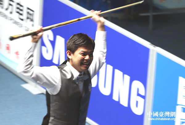打入最后一顆花球后,郭柏成自信的指向球臺(tái)上的黑色八號(hào)球。(中國(guó)臺(tái)灣網(wǎng) 鐘寶華 攝)
