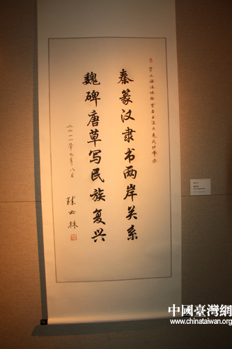 海協(xié)會(huì)會(huì)長(zhǎng)陳云林書(shū)法作品“秦篆漢隸書(shū)兩岸關(guān)系 魏碑唐草寫(xiě)民族復(fù)興” 。(中國(guó)臺(tái)灣網(wǎng) 李桂英 攝)