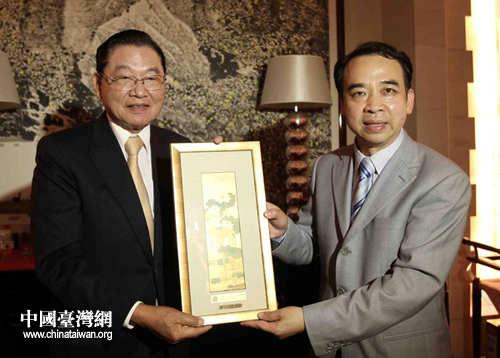 海基會董事長江丙坤向襄陽市委書記范銳平贈送紀念品。(趙興沛 攝)