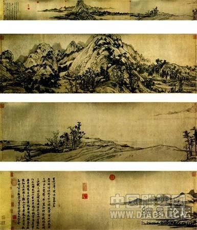 許多年來,兩岸書家和有心之士多方努力,希望有朝一日能『破鏡重圓』重新拼合此畫。畫的后段(長段)從吳家流散后,曾經(jīng)歷多人收藏,于清乾隆十一年流人清宮。有意思的是,號稱風(fēng)雅的乾隆皇帝居然不識寶,認(rèn)定它是贗品,而對另一卷他人臨摹的《富春山居圖》大加賞贊,又是題跋又是鈐印。但也幸而如此,那卷真跡倒借此得以“全璧”,后在解放前夕運往臺灣,歸臺北故宮博物院收藏。