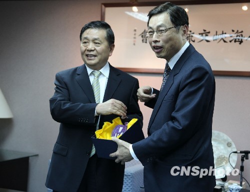 由海協會副會長王富卿率領的海協會民族暨宗教交流訪問團一行3月18日抵達臺北。圖為王富卿(左)一行18日晚前往海基會拜訪,受到海基會副董事長兼秘書長高孔廉(右)的接待,高孔廉向王富卿贈送一只仿宋鈞窯瓷瓶。 中新社發 耿軍 攝
