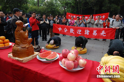 中新網成都4月17日電 (記者 楊杰)17日上午,在“三國圣地”成都武侯祠博物館三義廟,臺灣民間文化團體“十分老街觀光發展協會”舉行了隆重的祭典儀式,恭迎先賢忠烈“諸葛亮”赴臺,以弘揚忠、義、仁、智的精神。