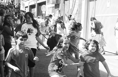 8月26日,圣塞巴斯蒂安·德·洛斯雷耶斯專為兒童舉辦了奔牛節。圖為孩子們正在和人力控制的“奔牛”賽跑。 人民網記者 丁大偉攝