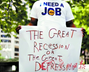 一失業(yè)者手持“經(jīng)濟(jì)大衰退或經(jīng)濟(jì)大蕭條”牌子