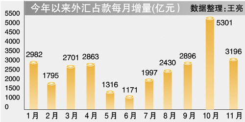 中國人民銀行昨日公布的數據顯示,11月新增外匯占款為3196.43億元人民幣,較10月的5301.8億元回落約四成,但仍超過3000億元。10月中國外匯占款數據曾創下33個月來新高,亦為歷史次高。
