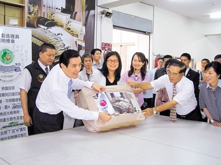 馬英九參與億進寢具棉被的制作流程后,與“陸委會”主委賴幸媛,親自將代表臺灣制造的MIT標志貼上。圖片來源:臺灣《中國時報》