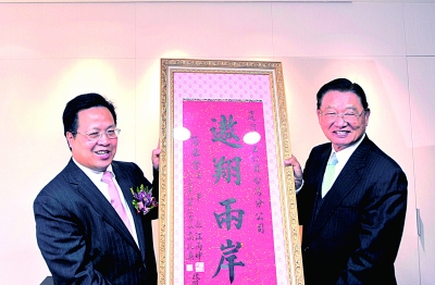 中國國民黨榮譽主席吳伯雄(右三)、海基會董事長江丙坤(右二)等與廈航總經理車尚輪(左三)共同出席廈航臺灣分公司剪彩儀式。