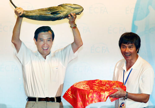 馬英九昨天到高雄市出席“兩岸經濟合作架構協議(ECFA)座談會”,與養殖、鋼鐵等業界座談。業者都非常感謝臺當局簽訂ECFA,讓業界獲益良多。受益的業者甚至提來一堆秋刀魚、石斑送給馬英九,讓現場響起熱烈掌聲。