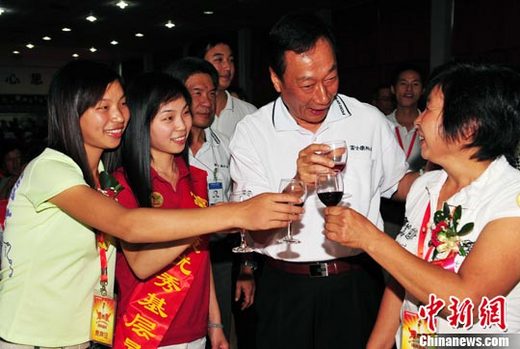 10月16日中午,富士康科技集團總裁郭臺銘在深圳宴請140名優(yōu)秀基層員工家屬,并邀優(yōu)秀基層員工于寧寧(左二)的雙胞胎妹妹加入富士康工作。 中新社發(fā) 陳文 攝