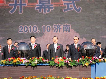 “2010年山東臺(tái)灣名品博覽會(huì)”昨日在山東濟(jì)南展開(kāi),山東省委書(shū)記姜異康(左二)和臺(tái)灣外貿(mào)協(xié)會(huì)董事長(zhǎng)王志剛(右三)共同出席開(kāi)幕典禮。圖片來(lái)源:臺(tái)灣中國(guó)時(shí)報(bào)