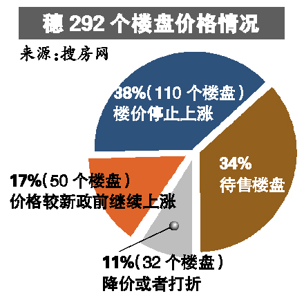 搜房網(wǎng)近日統(tǒng)計了全市292個樓盤,其中有50個樓盤價格較新政前繼續(xù)上漲,占比高達(dá)17%;樓價停止上漲的樓盤有110個,占比為38%;只有32個樓盤出現(xiàn)比較明顯的降價或者打折,占比為11%;另外34%為待售樓盤。而二手市場上,一些投資型業(yè)主開始拋售房源,但是降價幅度一般都在5%~10%左右。
