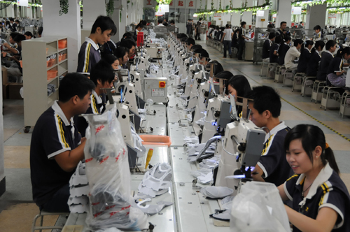 這是8月2日拍攝的泉州市一家大型鞋服企業生產車間一角。這家企業積極實施工資集體協商穩定職工隊伍。 新華社記者 來建強 攝