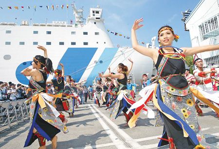 大陸客貨兩用輪“中遠之星”10日首航高雄港,現場邀請原住民舞蹈團迎賓。圖片來源:臺灣《中國時報》