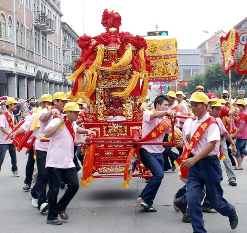 當日,福建泉州舉行“2010溫陵媽祖會”祈福祭祀活動,兩岸信眾匯聚泉州參加在此舉行的媽祖巡安踩街民俗活動及大型仿古祭祀儀典。新華社發(顏財斌 攝)