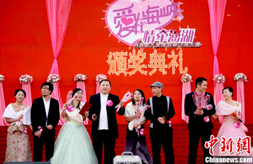 當(dāng)天下午,兩岸新人身著婚紗禮服盛裝登臺(tái),向現(xiàn)場(chǎng)觀眾展示在澎湖期間攝制的愛情故事短片。同時(shí),他們還各顯神通,秀恩愛、展才藝,為拉選票做著最后的沖刺。最終,經(jīng)過手機(jī)短信、網(wǎng)絡(luò)投票以及由閩臺(tái)影視專家組成的評(píng)委會(huì)評(píng)選,來自福建的賈維、莊秀蘭榮膺2010年度最佳海峽新人。