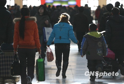 1月21日,一對母子在北京站準備上車。北京鐵路局根據(jù)北京地區(qū)客流特點宣布,從1月20日起北京鐵路運輸部門進入春運狀態(tài),這比全國春運提前了10天,春運將一直持續(xù)到3月10日。 中新社發(fā) 蘇丹 攝