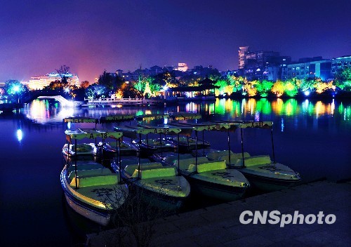 資料圖:放眼兩岸彩燈盞盞溢彩,河上水燈萬盞流金,燈光映水,水染燈色,煙水淼淼,燈影迷離,“桂林山水甲天下”,此言不虛。中新社發(fā) 濱海之光 攝