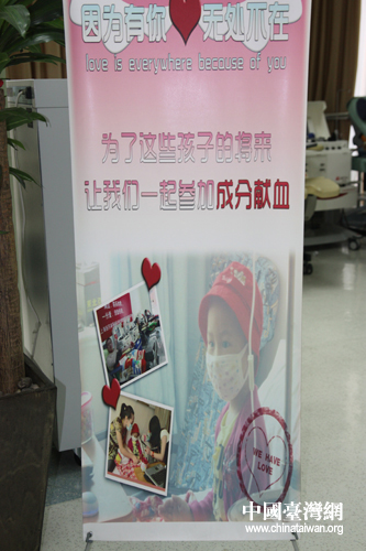 上海血液中心呼吁為患白血病兒童捐獻(xiàn)成分血的宣傳牌。(中國(guó)臺(tái)灣網(wǎng) 蕪?fù)?攝)