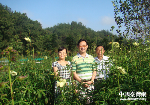 李樹(shù)金陪同縣臺(tái)聯(lián)副會(huì)長(zhǎng)胡遼云在三陽(yáng)黃蜀葵種植基地看長(zhǎng)勢(shì)。(圖片來(lái)源:歙縣臺(tái)辦)