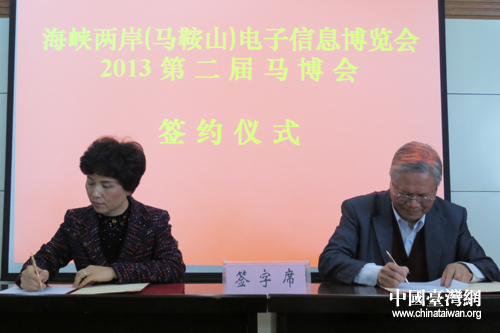中國臺灣網3月21日馬鞍山消息 日前,安徽省馬鞍山市副市長王曉焱和臺灣電機電子工業同業公會秘書長陳文義在馬鞍山市開發區管委會簽訂協議,共同舉辦海峽兩岸(馬鞍山)電子信息博覽會。