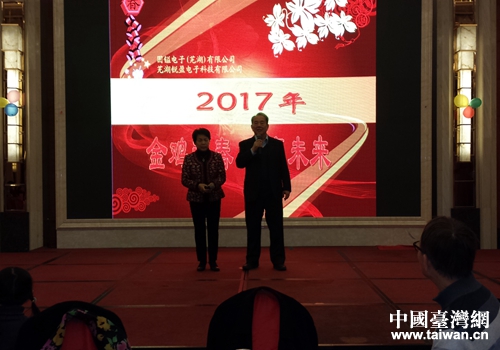 中國臺灣網1月17日蕪湖訊 雞報小康隨日出,年迎大有伴春來。值此辭舊迎新之際,2017年1月15日,蕪湖市臺協會長企業固鎰電子(蕪湖)有限公司和蕪湖銳盈電子科技有限公司,為了感謝全體員工一年來的辛勞和付出,在升輝西方財富大酒店舉辦了以“金雞迎春、共贏未來”為主題的2016年度尾牙聯歡會。公司董事長陳鑒章先生、總經理陳輝章先生等公司領導和全體員工,以及特邀嘉賓湖北襄陽市鹿門山旅游集團董事長王碧緣女士和蕪湖市臺協會常務理事等共200余人參加了此次尾牙聯歡會。