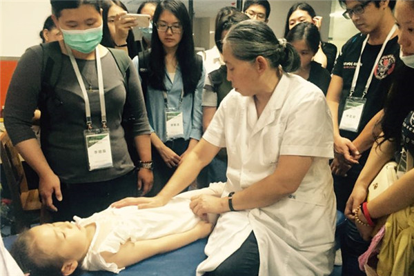 同學(xué)們在小兒推拿科遲遲舍不得走。孫安達主任、呂子萌主任跟前始終圍著同學(xué)們。中醫(yī)學(xué)2013級王彥婷同學(xué)說:“孫老師演示了用推陰陽、摩腹、補脾經(jīng)、運內(nèi)八卦等手法來健運脾氣,達到化食消積、化痰等作用。還有由腕推至肘腕的清天河水手法,來治療小兒發(fā)燒。其中最印象深刻的是老師捏脊的手法,快速精準(zhǔn)卻輕柔,被施以手法的小兒并未啼哭,反而怡然自得,改變了以往我對捏脊會造成小兒不適疼痛的印象,令我收獲良多。”