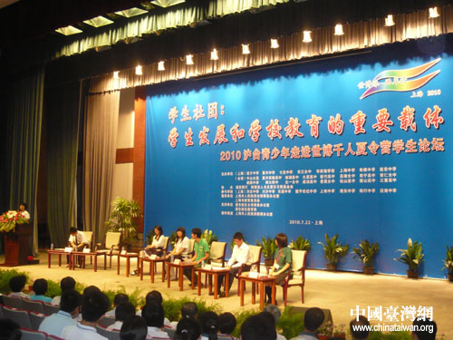 中國臺灣網7月23日上海消息 7月22日上午,滬臺兩地24所學校主辦、32所學校共同參與的“學生社團:學生發展和學校教育的重要載體——2010滬臺青少年走進世博千人夏令營學生論壇”在上海市進才中學舉行,滬臺29所中學的校長與千名師生共享一場有關學生社團話題的青春盛筵。