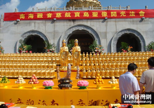 中國臺灣網9月19日舟山消息 日前,普陀山佛教協會在觀音圣地浙江普陀山南海觀音大佛廣場舉行了隆重的“南海觀音慈航寶島”圣像開光法會,為即將于27日啟程送往臺灣觀音“四大法脈”月眉山、法云寺、觀音山、大崗山千處寺院敬奉的1000尊南海觀音像開光。