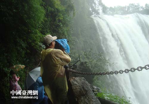 距大瀑布還有數(shù)里之遙,就看到大瀑布沖擊陣陣水霧從峽谷中涌出,伴隨隆隆水聲,記者們已感受到大瀑布的雄壯。有幾位女記者指著水霧漫起的地方,驚呼道:大瀑布在那邊!大家通過瀑布對面半山腰的觀光便道向瀑布方向走去,才看到瀑布露出部分就被吸引住了。《聯(lián)合報》記者黃宏璣、《中國時報》記者沈揮勝、《臺灣新聞網(wǎng)》記者許振澤對著瀑布不停地舉起相機、攝像機。走到瀑布正面,只見藍色的河水頃刻間變成近百米寬的白色水幕,從數(shù)十米高的懸崖上如萬馬奔騰飛馳而下,猛烈地撞擊著谷底深潭,發(fā)出雷鳴般的吼聲,濺起沖天的水霧,情景壯觀極了。半山上風(fēng)大,此時,風(fēng)夾著雨、雨伴著水霧,分不清是雨水還是霧水。驚喜的記者們身著雨衣,忙著給瀑布照相、攝影,忙著與瀑布合影。《人間福報》記者林藝斌,是臺灣著名的360度攝影大師,他到過黃果樹大瀑布多次了。他曾在安順二十多天,拍攝山水風(fēng)光、民族風(fēng)情,之后,安順臺辦編輯出版了《安順三百六十度攝影》,在大陸臺灣受到高度評價。林大師感慨道:“太美了,來了好多次了還是看不夠,到過黃果樹大瀑布的人,沒有誰說不震撼!”