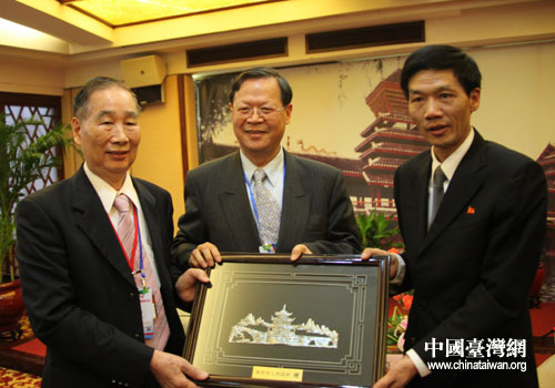 貴州省貴陽市市長李再勇(右一)向臺灣嘉賓贈送帶有貴陽民族特色的紀念品(貴陽市臺辦 胡珊珊 攝)