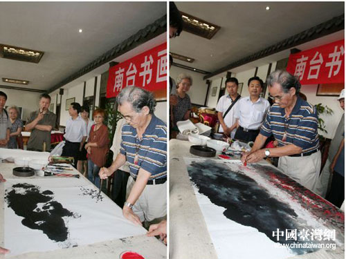 上午9時,4位來自臺灣的高齡書畫家與南充本地4位書畫家進(jìn)行了交流座談,臺灣書畫家代表團(tuán)對南充秀美的自然風(fēng)光與深厚的歷史文化,表現(xiàn)出了極大的興趣。座談會一結(jié)束,臺灣書畫家們便按捺不住自己激動的心情,揮毫潑墨,無償為南充留下了墨寶。左彥祿先生的隸書“放懷自適”,張志焜先生的行書“藝文雅匯”,周榮源先生的山水畫“秋韻”,潘麗生先生的行書“故鄉(xiāng)萬里情”,贏得了現(xiàn)場觀眾的滿堂喝彩。