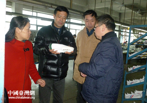 陳推一行在臺(tái)企寶峰鞋業(yè)公司視察。(圖片來(lái)源:黃石臺(tái)辦)
