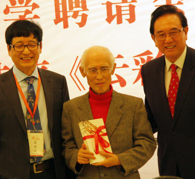 江丙坤在襄陽光彩臺商產業園題詞“共創雙贏”。(金順勇 攝)