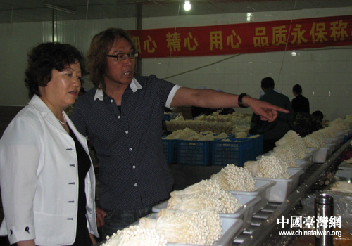 丹東市臺(tái)辦主任李秀環(huán)一行參觀金針菇生產(chǎn)車(chē)間。(圖片來(lái)源:丹東市臺(tái)辦)