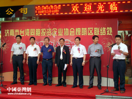 中國(guó)臺(tái)灣網(wǎng)7月2日濟(jì)南消息 日前,山東濟(jì)南市臺(tái)灣同胞投資企業(yè)協(xié)會(huì)槐蔭區(qū)聯(lián)絡(luò)處揭牌儀式在濟(jì)南市槐蔭區(qū)張莊路茶業(yè)市場(chǎng)舉行。山東省臺(tái)辦副主任曹曉武,濟(jì)南市臺(tái)辦副主任張端武,濟(jì)南市槐蔭區(qū)副區(qū)長(zhǎng)董傳師,濟(jì)南市臺(tái)資企業(yè)協(xié)會(huì)會(huì)長(zhǎng)王金銷、副會(huì)長(zhǎng)陳世偉,濟(jì)南茶葉市場(chǎng)總經(jīng)理劉勇和部分臺(tái)商出席活動(dòng)。