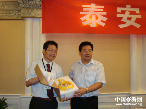 雙方互贈(zèng)禮品。(圖片來(lái)源:泰安市臺(tái)辦)