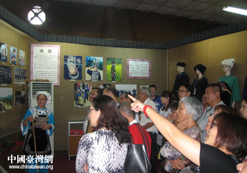 臺灣的少數民族團員們參觀了三都水族博物館,觀看了水族的水書、服飾等民俗文化展覽,了解了當今的水族同胞,寫水書、說水語、用水歷、著水衣、唱水歌、跳水舞,傳承著淳厚的水族風俗習慣。被譽為象形文字“活化石”的水書,至今廣為使用。水族的端節、水書、馬尾繡被列為國家級首批非物質文化遺產名錄。