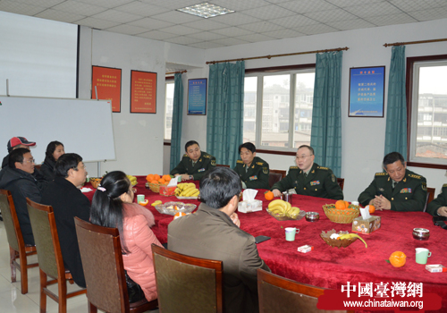 中國(guó)臺(tái)灣網(wǎng)1月16日瀘州消息 1月16日,瀘州市委臺(tái)辦主任韓俊平、市委研究室主任史乃廣、市婦聯(lián)主席陳孝冰一行帶著慰問(wèn)品看望慰問(wèn)了駐瀘某軍代室官兵,向官兵們送上新年的祝福。同時(shí),三個(gè)部門負(fù)責(zé)人向軍代室通報(bào)了2012年各部門工作情況,軍代室首長(zhǎng)也向慰問(wèn)團(tuán)一行作了國(guó)防形勢(shì)宣教。(中國(guó)臺(tái)灣網(wǎng)瀘州市委臺(tái)辦通訊員 周貞勇)
