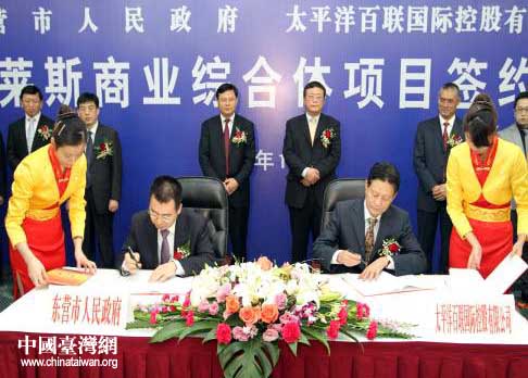 東營市人民政府、太平洋百聯(lián)國際控股有限公司奧特萊斯商業(yè)綜合體項目簽約儀式。(圖片來源:東營市臺辦)