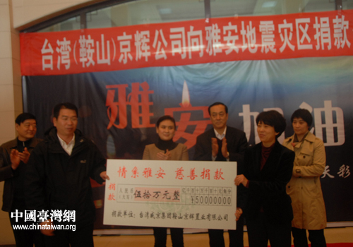 中國臺(tái)灣網(wǎng)5月15日鞍山消息 4月25日,臺(tái)灣威京集團(tuán)鞍山京輝置業(yè)有限公司通過市慈善總會(huì)向雅安地震災(zāi)區(qū)捐款50萬元人民幣,用于地震災(zāi)區(qū)的救災(zāi)和重建工作。