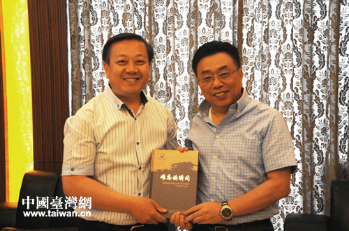 威海市臺(tái)辦主任于連波與東莞臺(tái)商會(huì)館大樓董事長(zhǎng)郭山輝互贈(zèng)紀(jì)念品。(圖片來源:威海市臺(tái)辦)