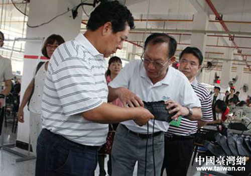 考察團(tuán)李世平(左一)一行在寧遠(yuǎn)縣臺(tái)資企業(yè)華榮鞋業(yè)考察,企業(yè)經(jīng)理曾文鋒(中)作講解。(圖片來(lái)源:寧遠(yuǎn)縣臺(tái)辦)